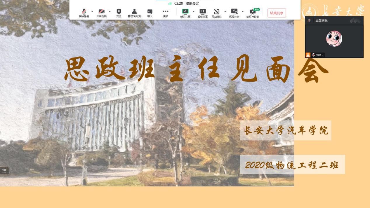 物流工程专业一班、二班通过线上形式举行思政班主任见面会。物流工程专业思政班主任马敏老师、20级辅导员杨磊老师及全体物流工程专业学生参加会议。