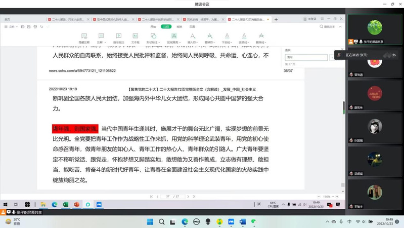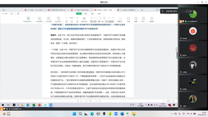 随后,张平老师以党的二十大代表徐留平同志的发言稿为基础,深层次的向同学们讲述了汽车产业的发展历史及未来中国汽车产业的发展方向,耐心地为同学们介绍了车辆工程专业未来的就业和发展趋势。也就这一问题,老师与同学们各抒己见,在线上进行了深入的交流。