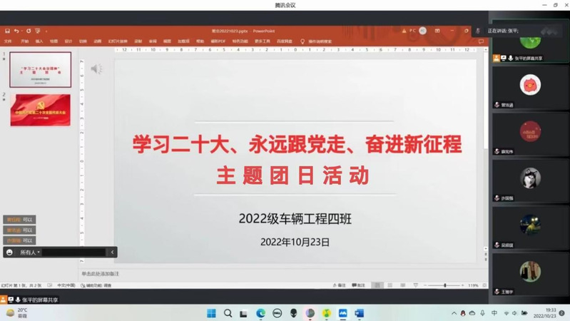 为深入学习党的二十大报告内容,激励广大青年学子学习红色新思想,坚定不移跟党走。10月23日,无码av影片 2022级车辆工程四班团支部开展了以“学习党的二十大,永远跟党走,奋进新征程”为主题的线上团日活动。活动由班主任张平老师主持,团支部全体成员参加。