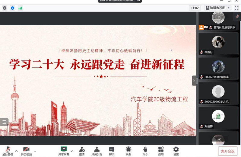 为深入学习党的二十大精神,全面贯彻习近平新时代中国特色社会主义思想,10月24日,无码av影片 2020级物流工程专业以线上会议的形式开展了“学习党的二十大,永远跟党走,奋进新征程”主题团日活动,活动由物流一班团支书曹育林主持,2020级物流工程专业全体同学和2020级辅导员杨磊参加。