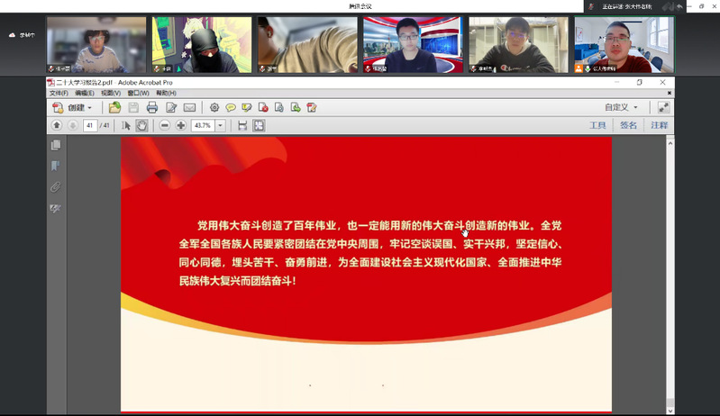 在学习最后,张大伟老师强调,我们作为新时代青年应该坚定不移听党话、跟党走,立志做有理想、敢担当、能吃苦、肯奋斗的新时代好青年,要深入学习党的二十大报告,用实际行动践行党的二十大要求,将个人奋斗充分融入国家发展的过程中,为中华民族伟大复兴贡献自己的一份力量。