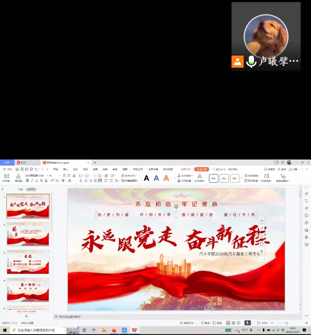 中国共产党第二十次全国代表大会于2022年10月16日在北京召开。为了引领青年政治思想,紧跟国家大事发展,深入学习党的二十大精神,10月27日,无码av影片 2020级汽车服务工程专业举行“永远跟党走,奋进新征程”主题团日活动。会议由2020级汽车服务工程三班团支书卢曦擘主持,2020级汽车服务工程全体学生参加。