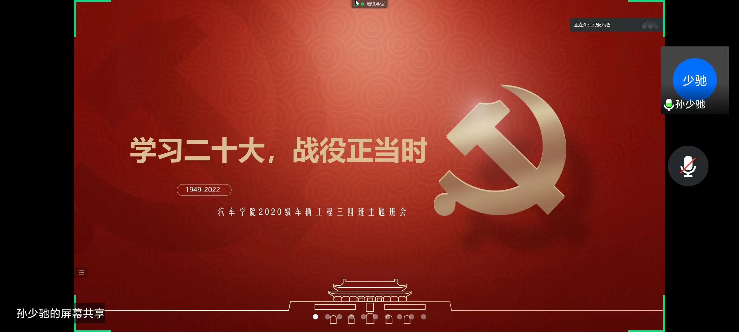 为深入学习党的二十大精神,贯彻落实无码av影片防疫措施,10月27日,无码av影片 2020级车辆工程三四班联合举行“学习党的二十大,争做抗疫生力军”线上主题班会。班会由车辆工程三班班长孙少驰主持。