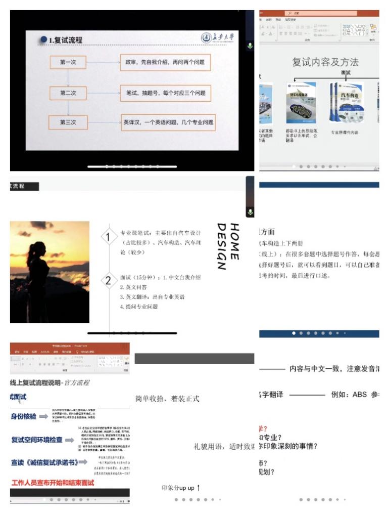 几位研究生同学从复试流程、复习方法、服饰礼仪以及心态调整等多个方面进行了经验分享,并结合个人经验向各位考研学生们分享了复试各个方面的具体内容,几乎涵盖了复试可能涉及到的所有内容。提问环节,研究生同学依次回答了考研同学们所提的问题。最后,参加分享会的同学纷纷表达了对学长学姐的感谢,整个分享会在轻松愉悦的氛围中结束。