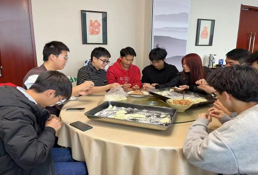 活动开始,杨倩老师向同学们讲述本次活动开展的意义及目的,将本次活动成员分为五组进行合作。在老师的指导下,大家开始动手包饺子,学习包饺子的技巧手法,锻炼了劳动能力。形状各异的饺子也包裹着大家对未来生活美好的期许。活动过程中,设置了“你划我猜”、“饺子大王”、“飞花令”等益智趣味游戏环节,同学们在游戏中展现了个人和团队的智慧和才华。饺子煮熟端上桌时,大家围坐在一起,品尝着亲手包的饺子,感受着浓浓的师生情和家乡味。