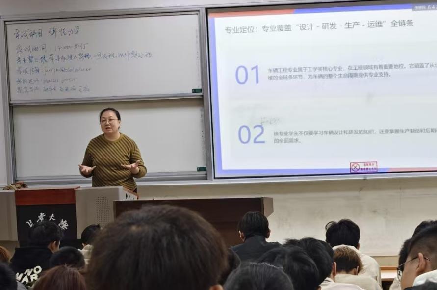在研讨课上,杨杨以“行业变革与专业机遇”为切入点,结合新能源汽车、智能网联汽车产业的爆发式发展态势,逐步深入到“本科人才培养核心要求”“大学四年学业规划路径”以及“科研与社会实践加分项”等内容,用详实的数据案例和清晰的逻辑框架,为新生们勾勒出一幅清晰的学业发展与职业导航图。同时,她针对性地提出阶段化发展建议:大一、大二需“厚植根基”,扎实掌握高等数学、力学等基础课程,力争学业成绩拔尖;大三应“聚焦内生”,通过参与学科竞赛、进入实验室协助科研项目等方式,着力提升实践与科研能力;大四则要“冲刺落地”,结合考研、就业、出国等不同方向精准发力,实现发展目标。