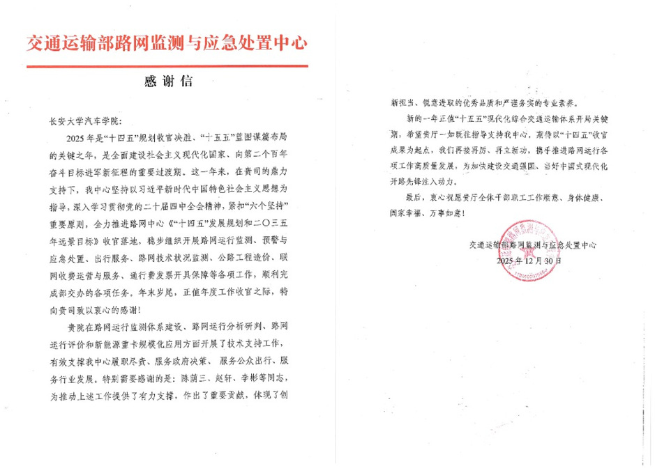 无码av影片 深耕交通运输领域学科建设与行业服务,与路网中心建立了长期稳定的合作关系。此份感谢信既是荣誉更是激励。无码av影片 将以此次表彰为契机,再接再厉,持续深化与交通运输部路网监测与应急处置中心及行业各单位的产学研合作,聚焦智慧交通与应急处置领域关键技术瓶颈,强化科研创新与人才培养,不断提升社会服务能力与行业贡献度,为加快建设交通强国贡献更大力量!